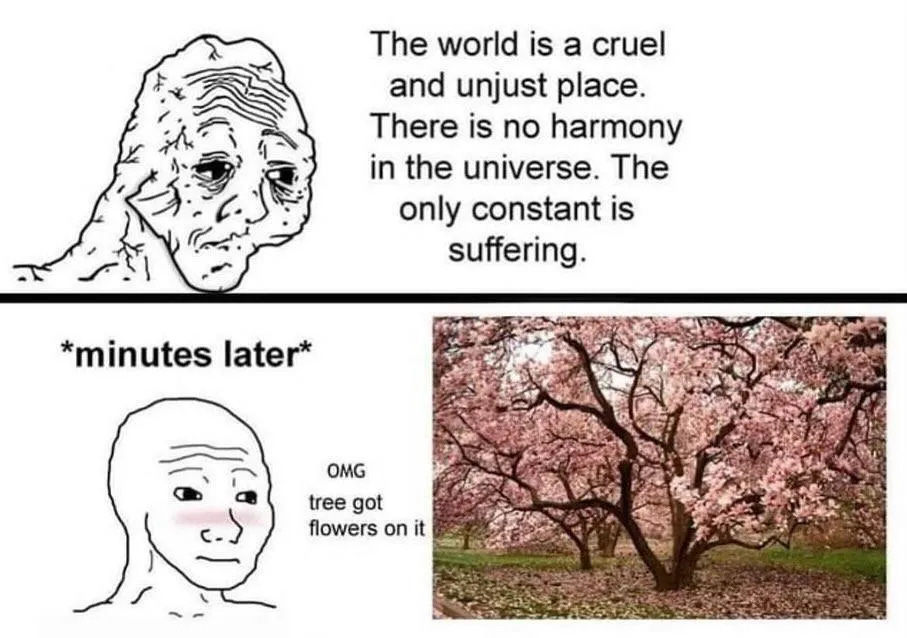 This meme reminded me of ME.. oh yea!! for sure… I am always thinking about the things that disturb me in this world… only to keep rounding the corner to find something about this REALITY that totally astonishes me.. While I was writing this post Tom Petty, my all time favorite music artist played on the radio a song called “SQUARE ONE”… I would like to get to that place…